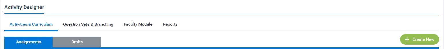 The Activities & Curriculum tab under Activity Designer is divided into two tabs and a button. First we will go over the Create New button, located to the right of the page, as shown above. if you would like to create an activity, click HERE.